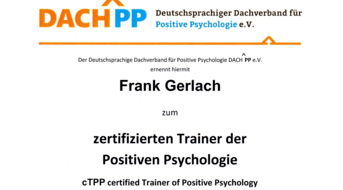 Nach 5 Jahren intensiven Fortbildungen hat Frank Gerlach 2022 diverse Zusatzqualifikationen mit Zertifikat abgeschlossen. Er ist jetzt zertifizierter Berater, Coach und Trainer für positive Psychologie.