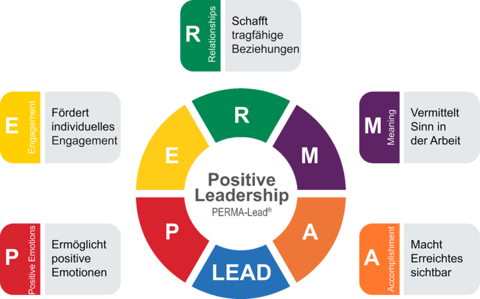 Der Wirtschafts- und Organisationspsychologe Dr. Markus Ebner (Universität Wien und Graz) hat das PERMA-Modell von Martin Seligman auf Führungsverhalten übertragen: Wenn diese 5 Aspekte nachweislich die Potentialentfaltung von Menschen fördern, muss erfolgreiche Führung darauf ausgerichtet sein, diese Bereiche bei Mitarbeitenden positiv zu beeinflussen. Und so wurde auf dieser Grundlage ein Positive Leadership Ansatz, das PERMA-Lead® Modell, entwickelt.